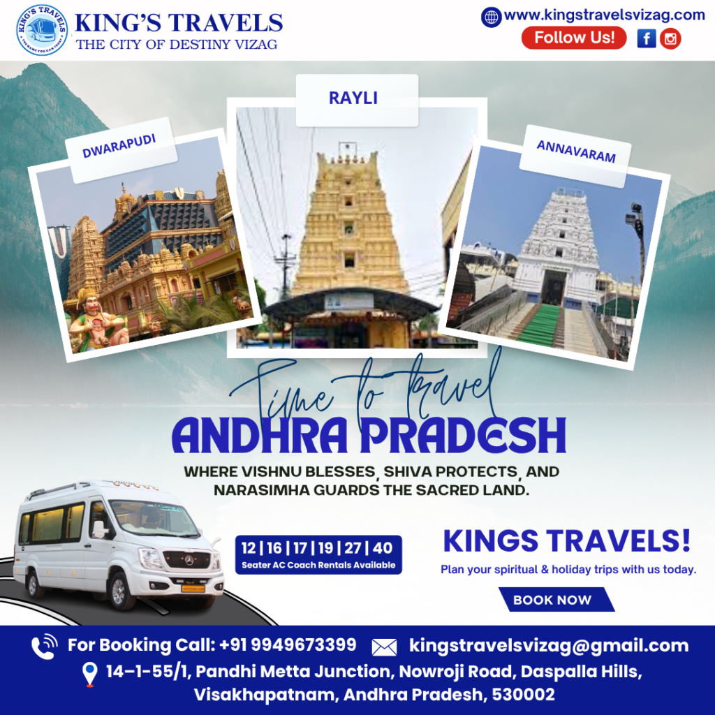 With King’s Travels Vizag, your trip through Andhra Pradesh’s sacred places becomes a hassle-free experience — brimming with comfort, devotion, and serenity. Whether you want to visit Dwarapudi, Rayli, or Annavaram, King’s Travels makes every mile count in bringing you closer to spiritual enlightenment.