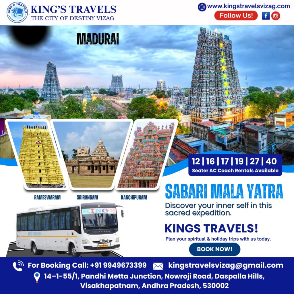 Whether you are booking your yearly Sabari Mala Yatra or a full-fledged South India Temple Tour, King’s Travels Vizag is your go-to travel companion for secure, comfortable, and spiritually uplifting tours.
